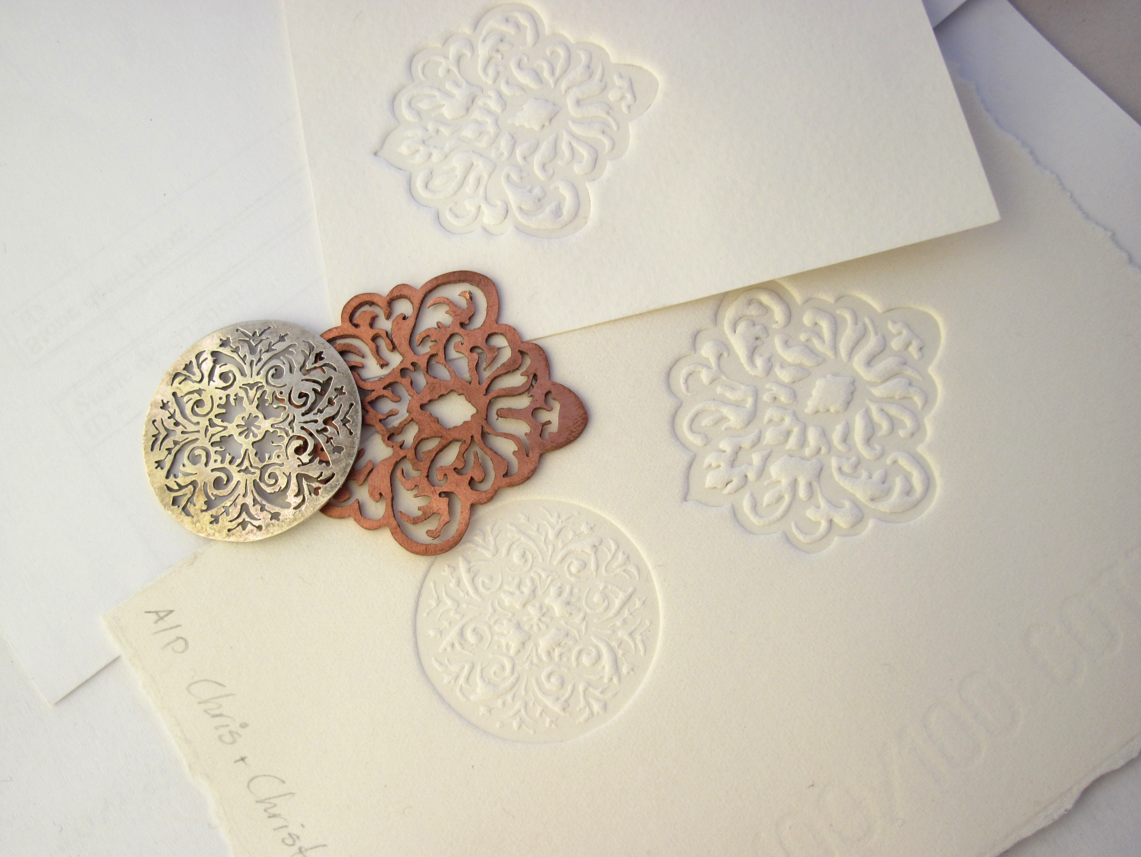 A process creating an engraved design in paper. Foil can be used too, giving much the same outcome with gold or silver.